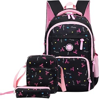 Sac à Dos Scolaire Fille, Sacs à Dos Primaire avec Sacs à bandoulière Sac de Stylo Sets de Sacs Scolaires pour Adolescent l’Étudiant(Noir)